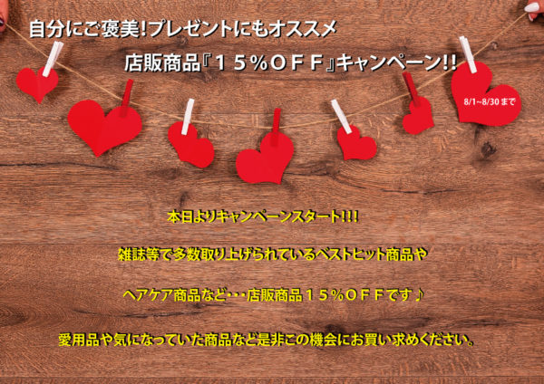 店販商品『15%OFF』キャンペーン「8月~8月30日まで」