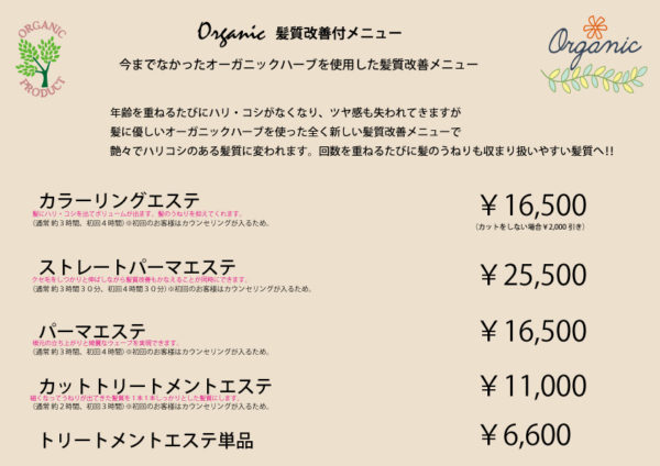 今までなかったオーガニックハーブを使用した髪質改善メニュー