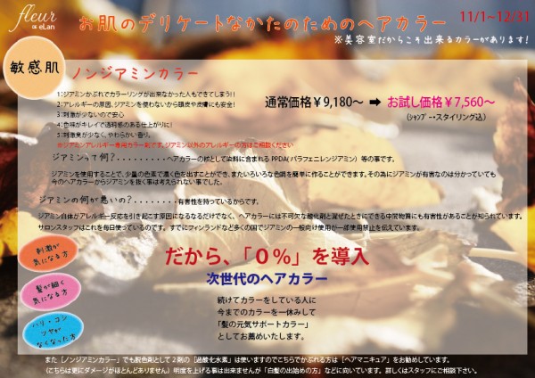 最近ニュースになったカラー施術によるかぶれの被害、皮膚炎が相次いでいますね!いつも同じカラー剤で染めていても突然皮膚炎を起こすこともあります。体調不良・免疫低下など様々な原因でなります。また一度かぶれを起こすと二度と同じカラー剤を使うことが出来なくなってしまいます。そうならないためにもエランでは