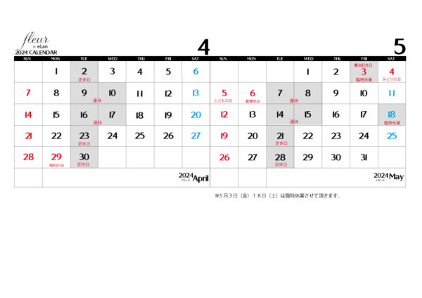 5月3日(金)18日(土)※臨時休業します。